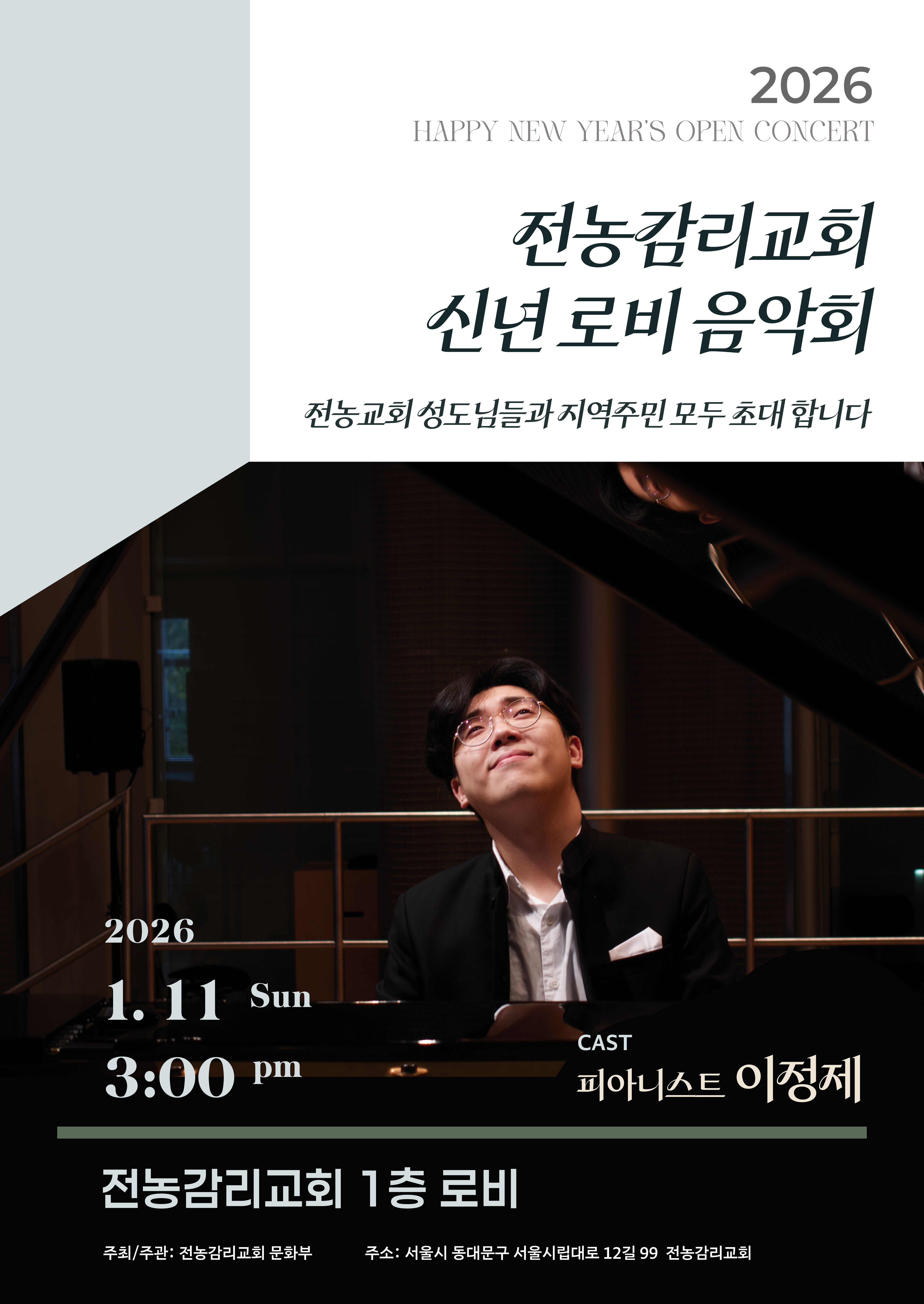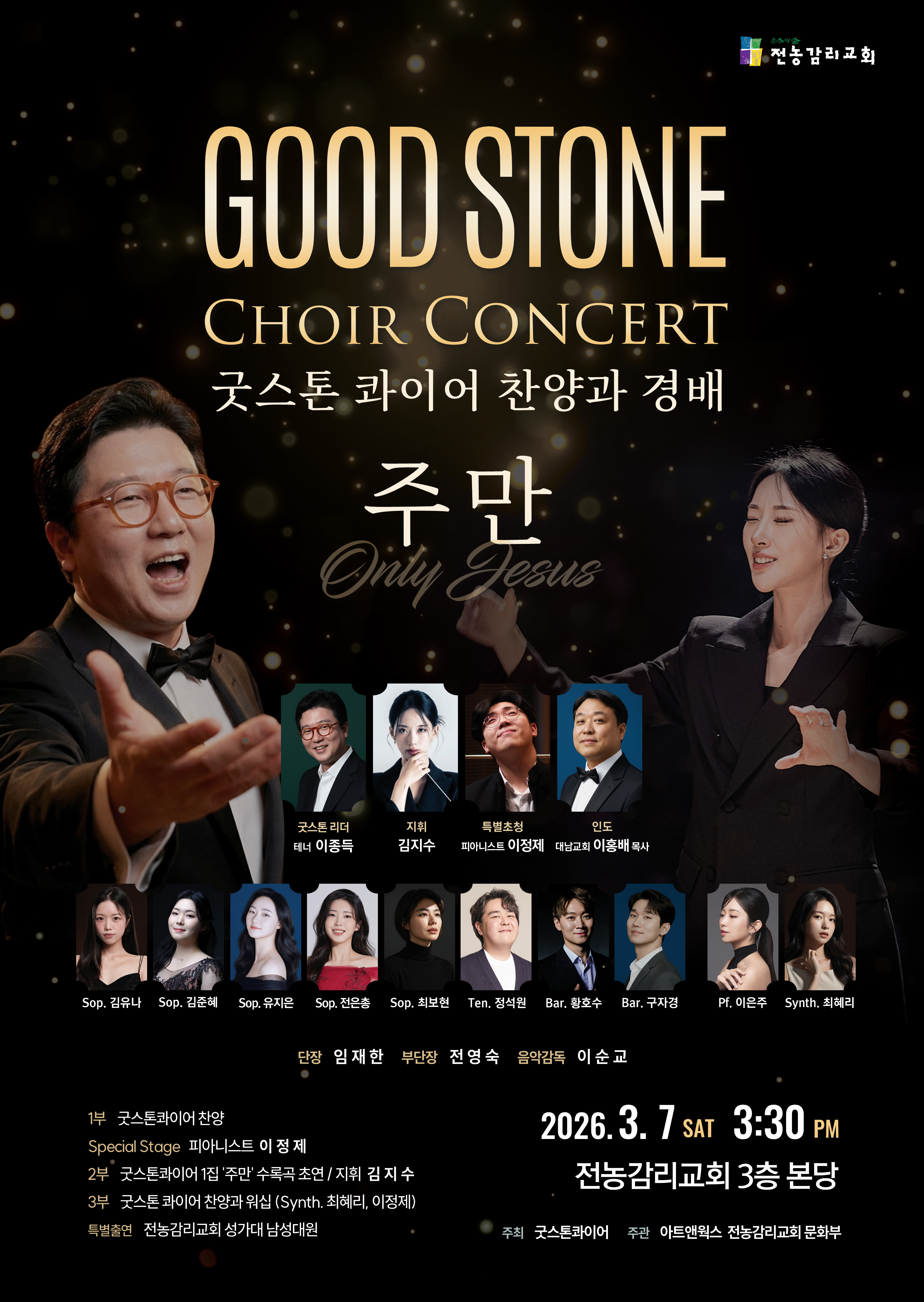 굿스톤콰이어 찬양과경배 '주만' 3월 7일 오후 3시 30분 전농감리교회 3층주최 굿스톤콰이어주관 아트앤웍스, 전농감리교회 문화부Contents1부 굿스톤콰이어 찬양 (독창)Speical Stage 피아니스트 이정제2부 굿스톤콰이어 1집 '주만' 수록곡 초연 / 지휘 김지수3부 굿스톤콰이어 찬양과 워십 (Synth. 최혜리. 이정제)특별출연 전농감리교회 성가대 남성대원, 카리스찬양단원 굿스톤콰이어가 전하는 깊은 울림의 찬양 집회, '주만'에 여러분을 초대합니다.이번 찬양과 경배의 시간은 3월 7일 오후 3시 30분, 전농감리교회 3층 본당에서 펼쳐집니다. 굿스톤콰이어가 주최하고 아트앤웍스와 전농감리교회 문화부가 공동으로 주관하는 이번 행사는 총 3부에 걸쳐 다채롭고 은혜로운 순서로 꾸며질 예정입니다.[프..