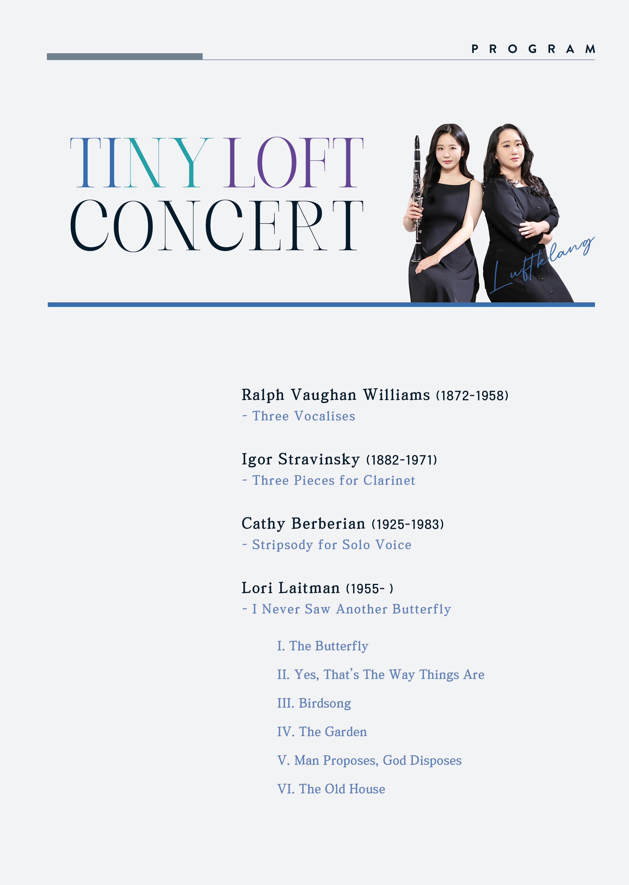 타이니로프트콘서트를 통해 성악과 클라리넷이라는 드문 조합이 가진 독창성과 가능성을 무대 위에서 실현하고자 하며, 레퍼토리는 Lori Laitman의 I Never Saw Another Butterfly, Ralph Vaughan Williams의 Vocalises 등 현대음악을 중심으로 구성하여 동시대 관객들과 감성적이고 지적인 소통을 시도하려고 합니다.