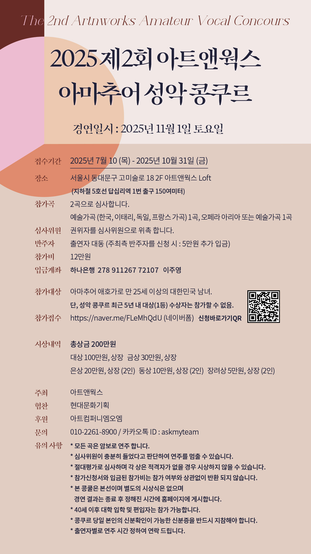 2025년도 제2회 아트앤웍스 아마추어 성악 콩쿠르 세부 요강