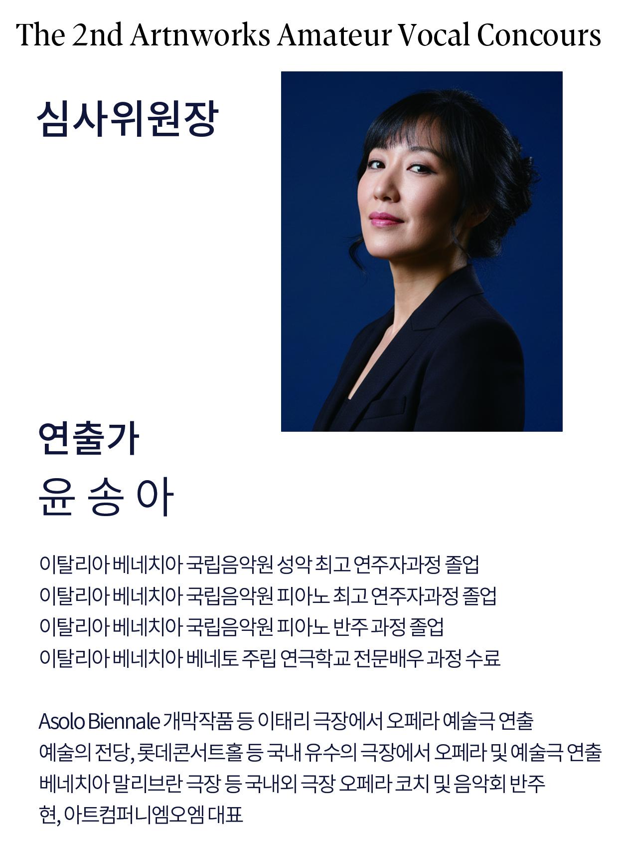 다시 한번 '제2회 아트앤웍스 아마추어 성악 콩쿠르'에 참여해주신 모든 분께 진심으로 감사드리며, 수상 여부를 떠나 무대 위에서 보여주신 여러분의 열정에 큰 박수를 보냅니다.