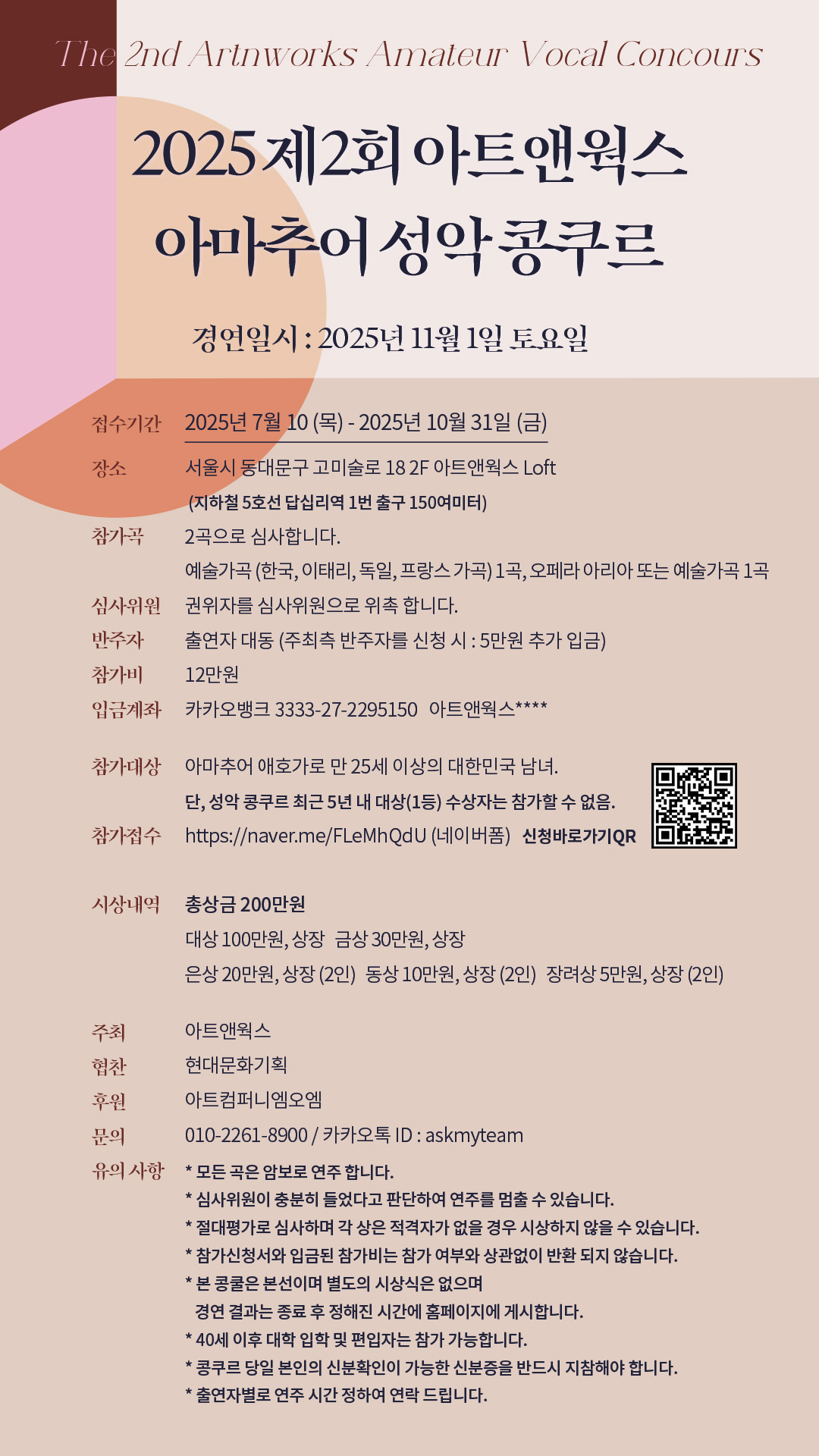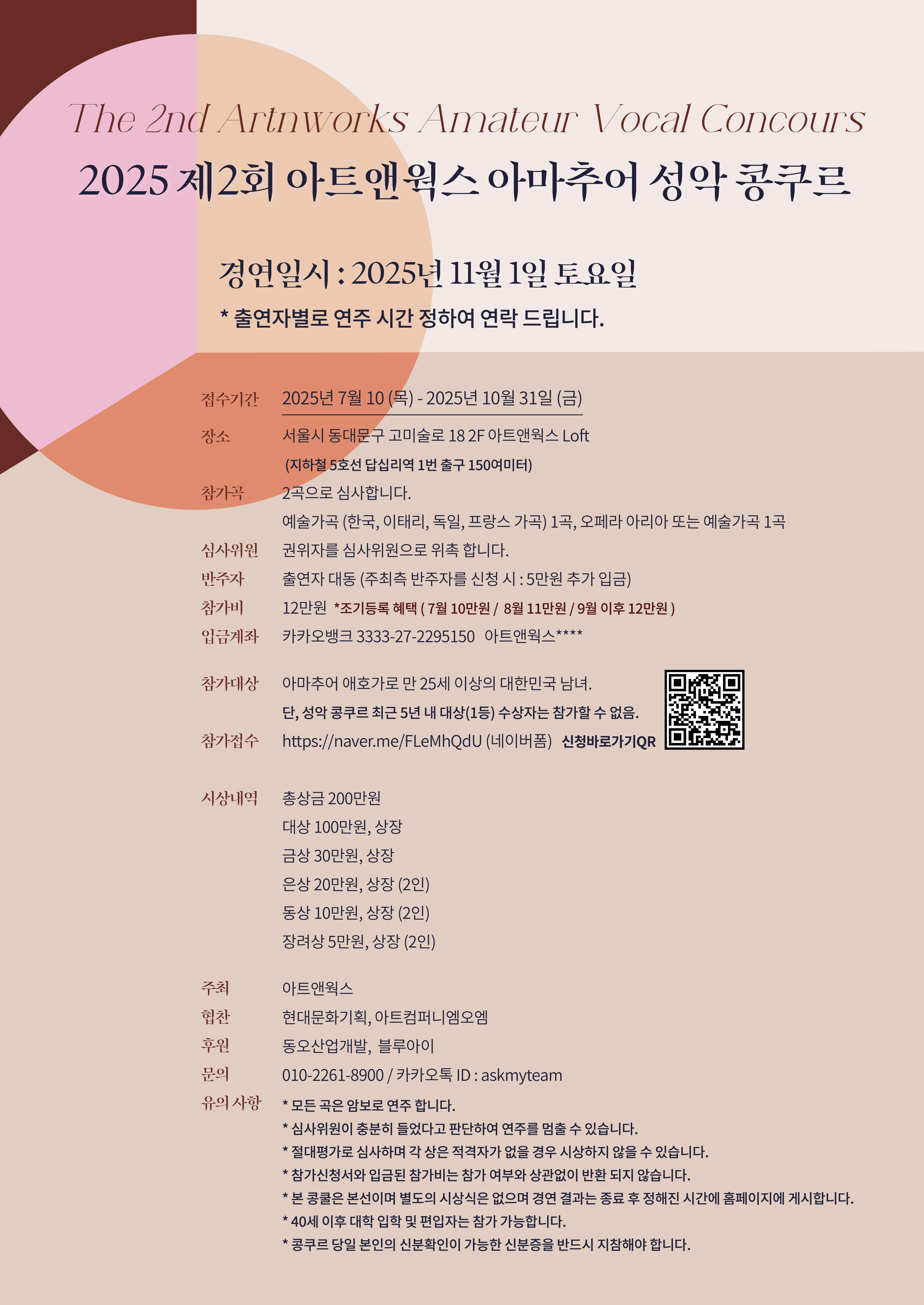 일상 속에서 순수하게 음악적 열정을 키워온 아마추어 성악 애호가들을 위한 무대가 올해도 마련된다. ‘2025년 제2회 아트앤웍스 아마추어 성악 콩쿠르’가 오는 11월 1일 토요일, 서울 동대문구에 위치한 아트앤웍스 Loft에서 열려 성악을 향한 아마추어들의 깊은 열정을 조명할 예정이다.이번 콩쿠르는 만 25세 이상의 대한민국 남녀 아마추어 성악 애호가를 대상으로 한다. 주최 측은 순수하게 노래에 대한 애정만으로 무대에 서고자 하는 성인 아마추어들에게 실력과 잠재력을 선보일 기회를 제공하는 데 중점을 두고 있다.경연 개요 및 참가 요강은 다음과 같다.참가자들은 예술성과 기량을 동시에 보여줄 수 있는 총 두 곡으로 심사에 임해야 한다. 경연곡은 예술가곡 1곡 (한국, 이태리, 독일, 프랑스 가곡 중 택일)과..